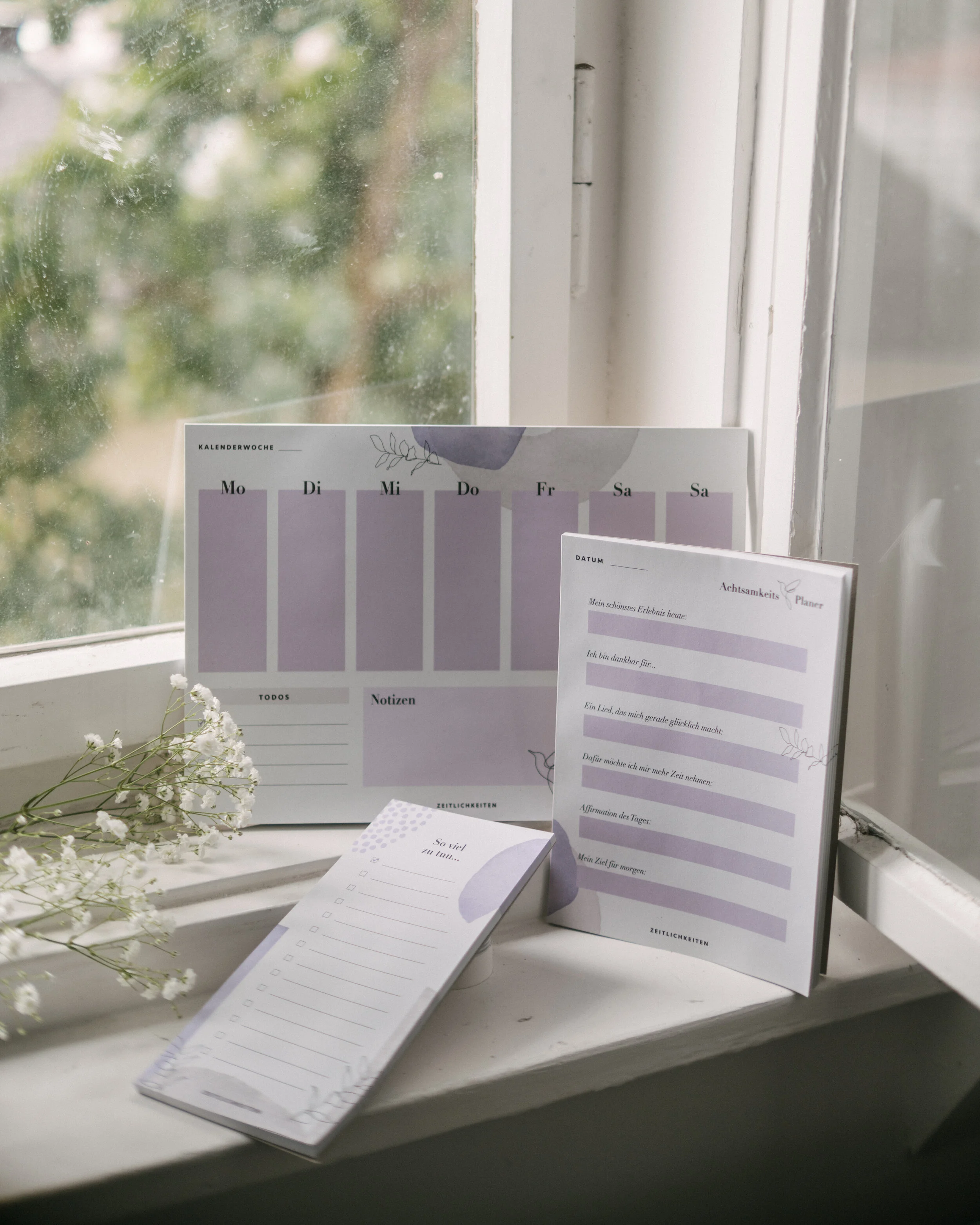 Im Oktober 2021 hat das Zeitlichkeiten Magazin eine Schreibwaren-Kollektion in Zusammenarbeit mit Coralinart Studio gelauncht. Unter dem Motto "Chaos auf Papier - Ruhe im Kopf" sind drei Produkte entstanden, die dabei helfen, ein organisiertes und achtsames Leben zu führen. Das Set, bestehend aus einem Wochenplaner, einem Achtsamkeitsplaner, sowie einem ToDo-Block, wurde auf Recyclingpapier gedruckt und kombiniert ein zartes Aquarelldesign mit Nachhaltigkeit.